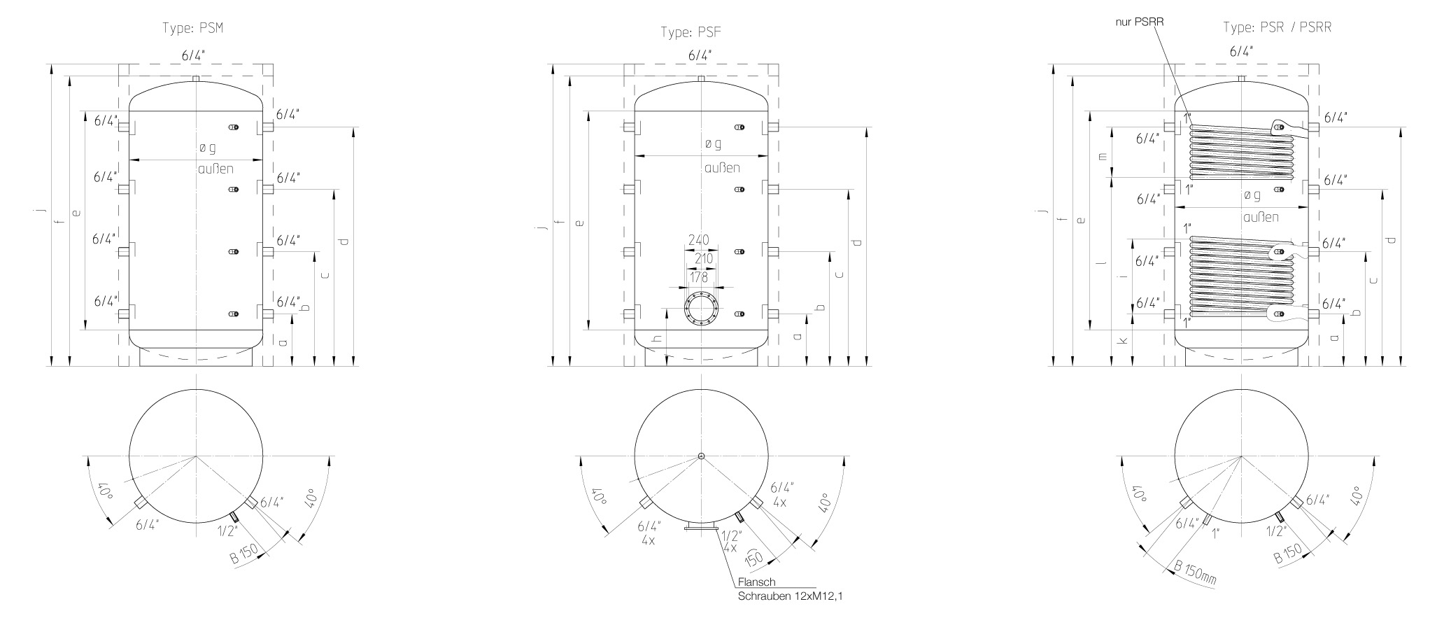 PSM – puffertartály 6/4” csatlakozó karmantyúkkalPSF (– PSM puffertartály D 240 karimával)PSR / PSRR – puffertartály (PSM + csöves hőcserélő) (PSR-1 csöves, PSRR-2 csöves)